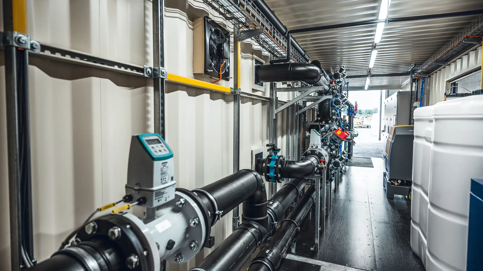The team led by Site Manager Harald Huebner supervised the project from the start and took care of preparing the construction area on site. After construction of the floor plate, the groundwater treatment plant was brought to the site in more than 15 truckloads. After arriving at their destination, the equipment components were lifted to the defined setup area using a 100-ton crane. Step by step, the various equipment components were then positioned: The filters were filled with gravel and activated carbon, the well pumps were installed, and pipes and wires were laid for the entire plant. In November 2024, it was finally time: The plant began operation. To celebrate this milestone, a press event was also held to inform the public and the media about the project.